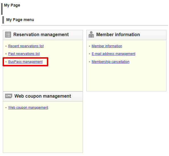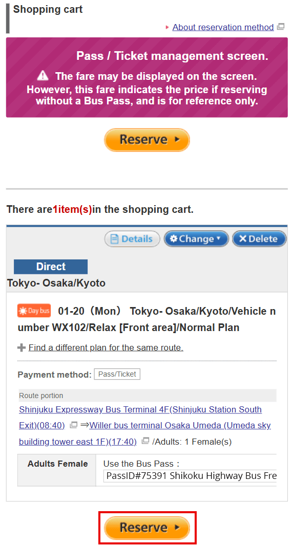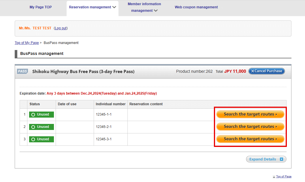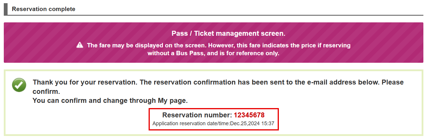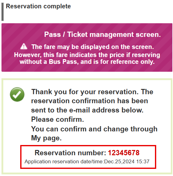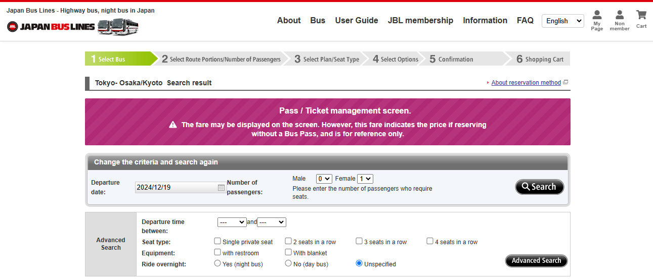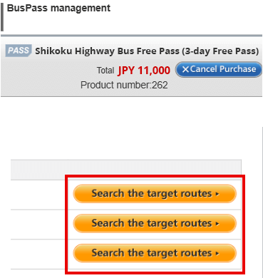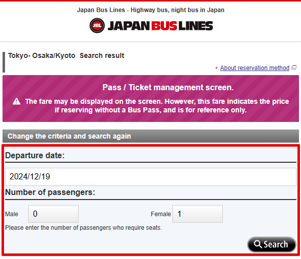 Make sure that “Pass/Ticket Management Screen” is displayed in the purple frame at the top of the search screen. If this is displayed, you can make a reservation using the bus pass and will not have to make an additional payment. If you do not see this message, you are using the regular bus search screen and additional payment is required.