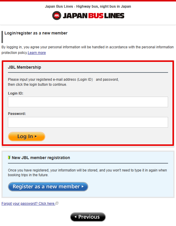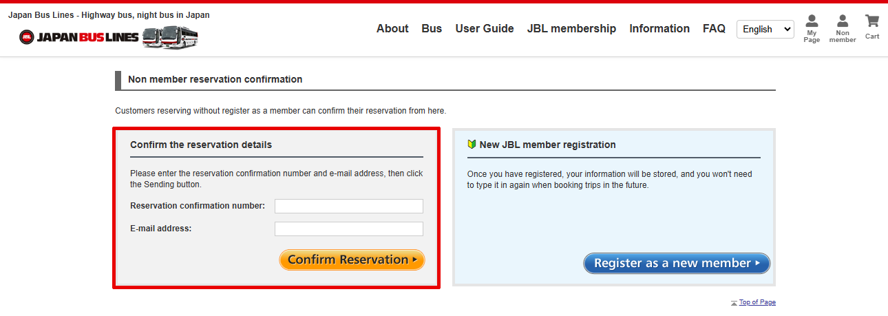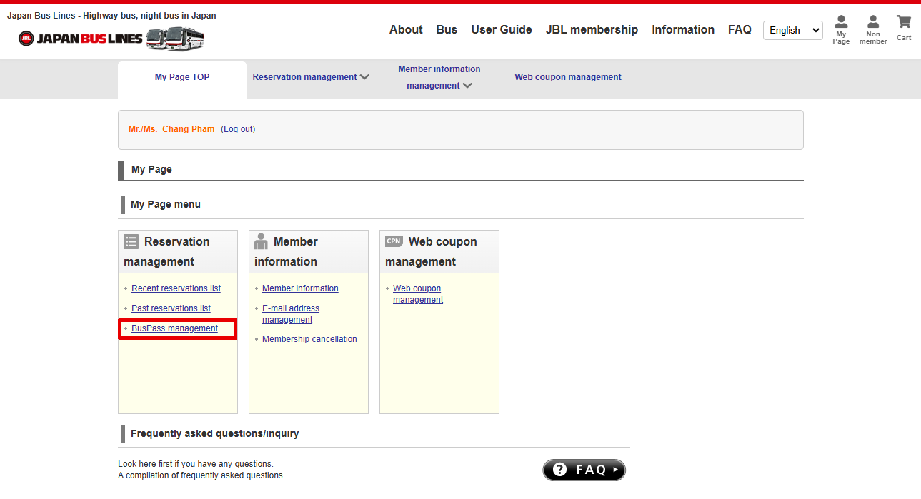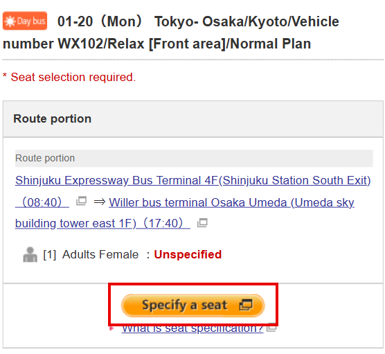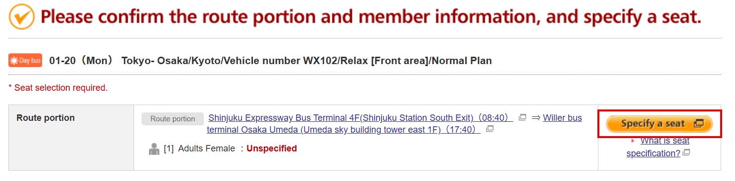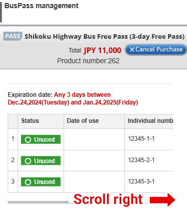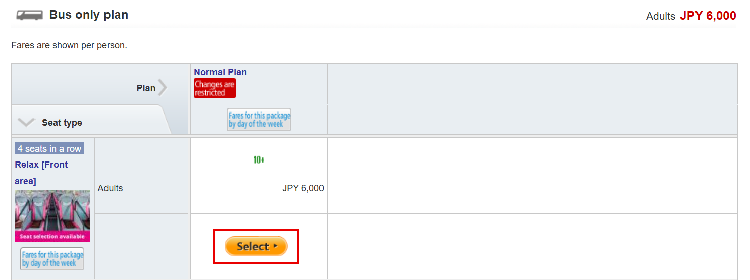 Make sure that “Pass/Ticket Management Screen” is displayed in the purple frame at the top of the search screen. If this is displayed, you can make a reservation using the bus pass and will not have to make an additional payment. If you do not see this message, you are using the regular bus search screen and additional payment is required.