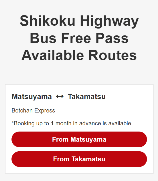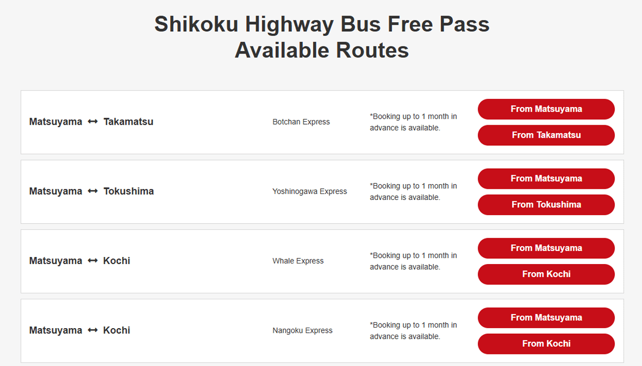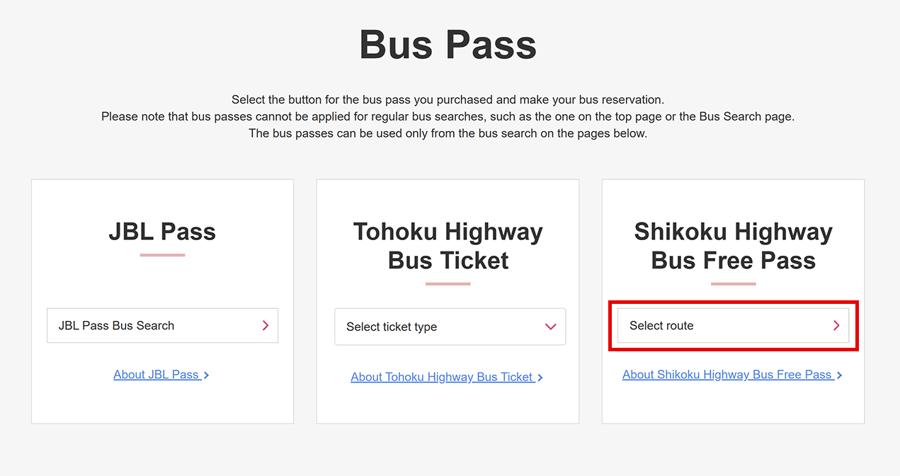 From the bus pass list, select "Shikoku Highway Bus Free Pass" and then click the departure point for your desired route on the next page.