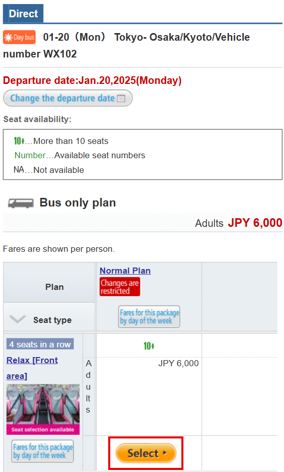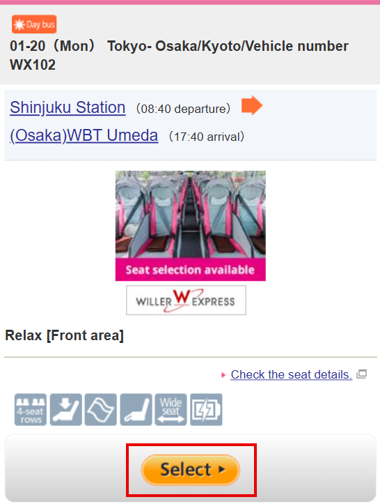 Choose the bus with the route and seat type you want, then click “Select” button.