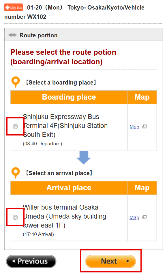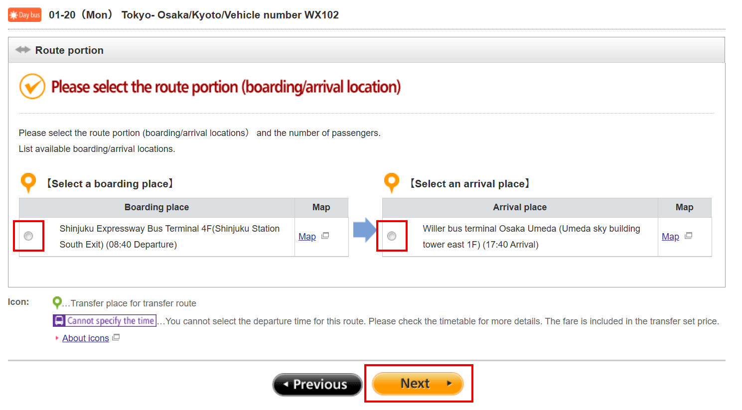 Choose the boarding and arrival place, then scroll down to the end of the page, click “Next”