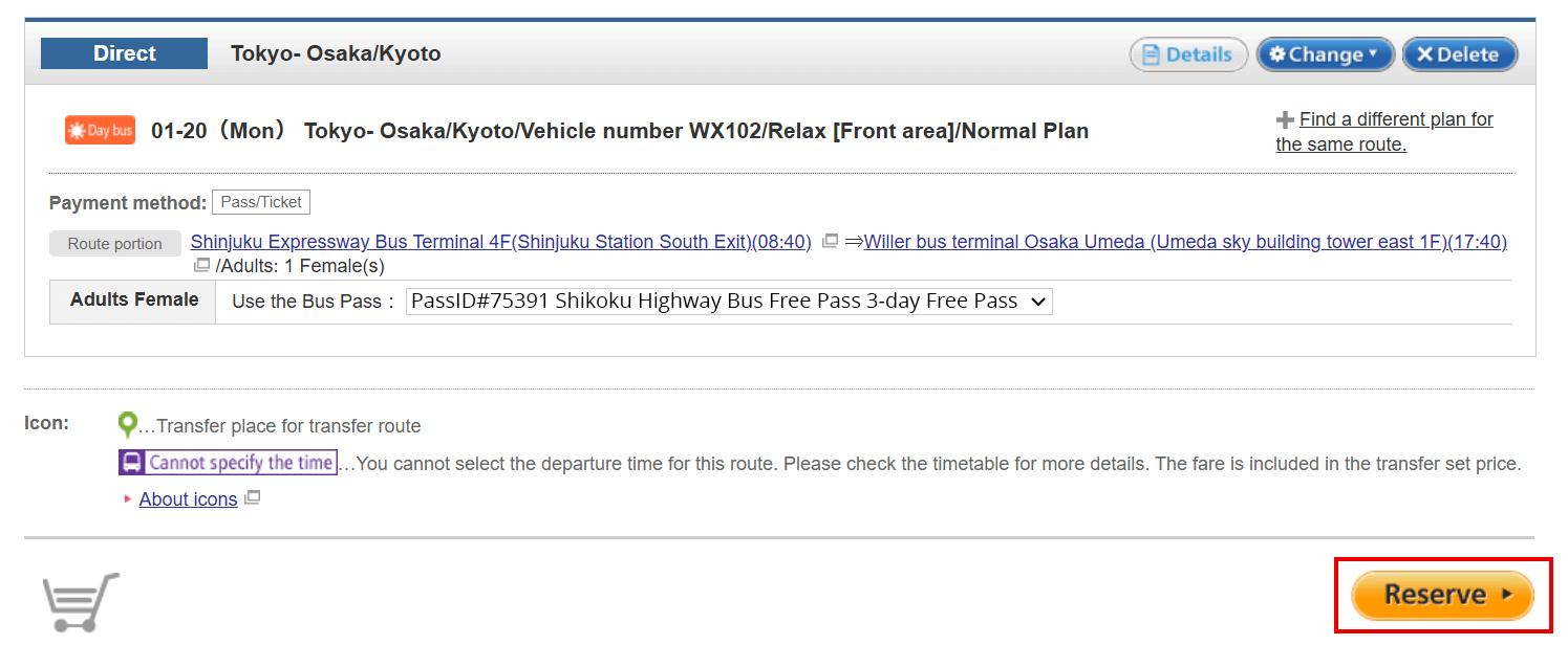 Reconfirm the bus pass number and the type of bus pass you want to use for your reservation and press the “Resereve” button.