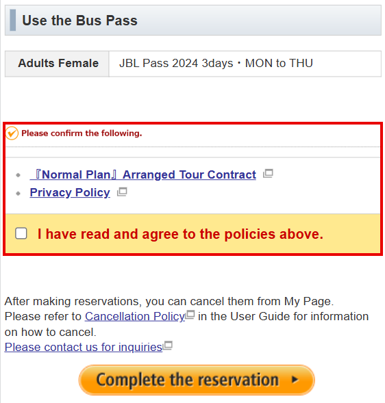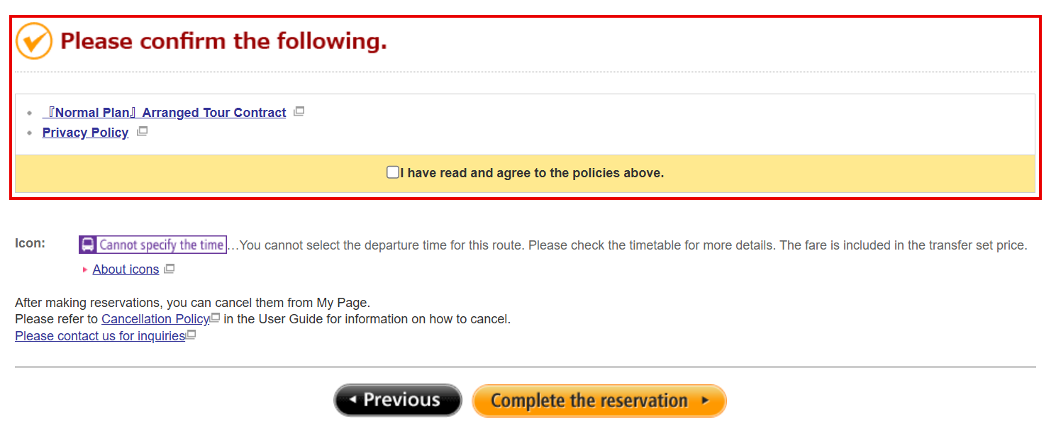 Confirm all the registered information, then check “I have read and agree to the policies above”, then click “Complete the reservation”